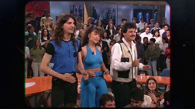 El plató estaba lleno de gente joven para recibir al grupo que era un fenómeno fan en la España de mediados de los 90. Nieves Herrero fue la primera periodista en entrevistar al grupo Camela.